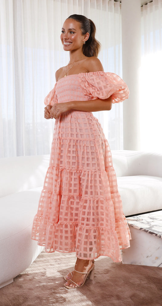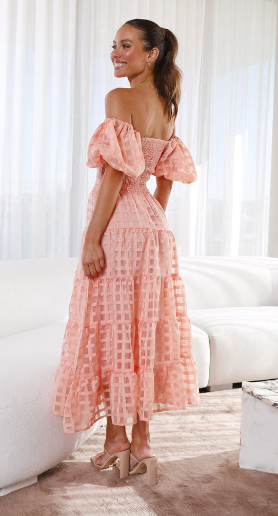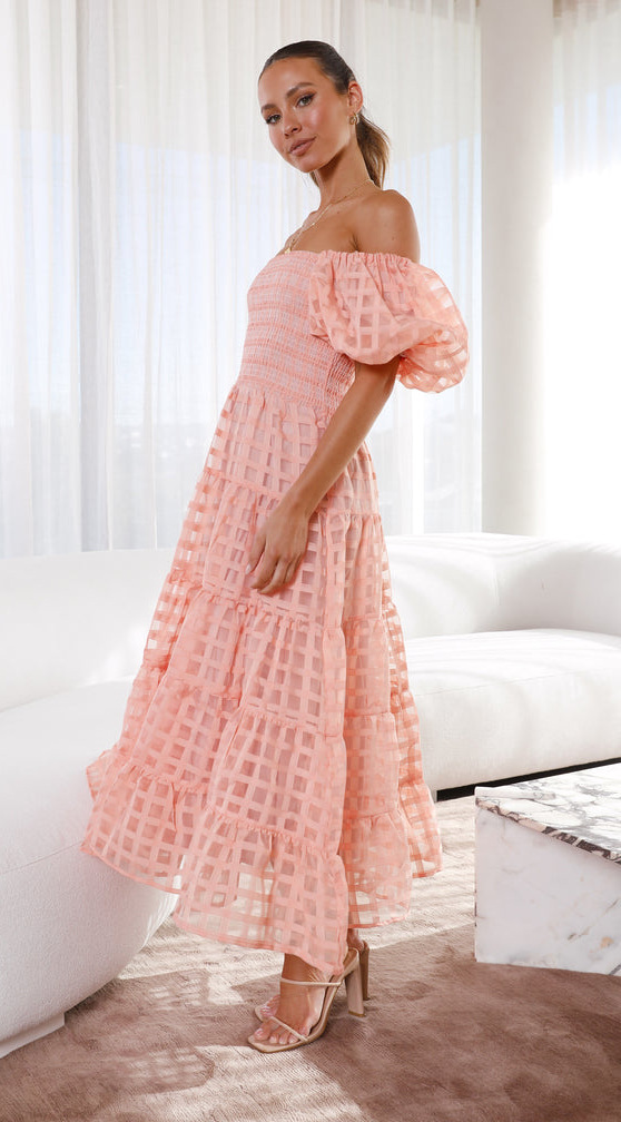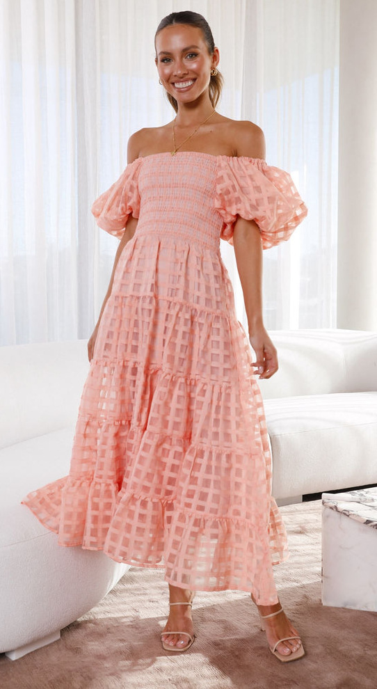 Light Pink Off the Shoulder Dress with Sleeves Long Smocked Bishop Dress Casual Summer for Women